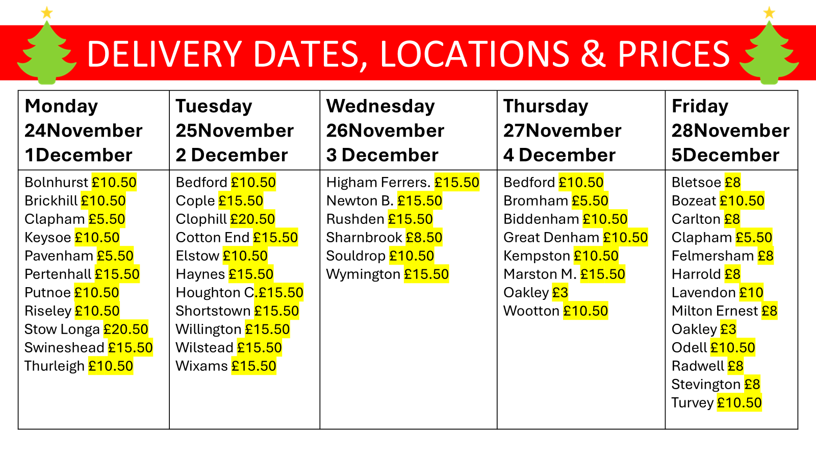 The days we plan to deliver trees to a certain location are not yet fixed and subject the change. Below is our proposal for 2025 & the final version will appear here before we open in November.
